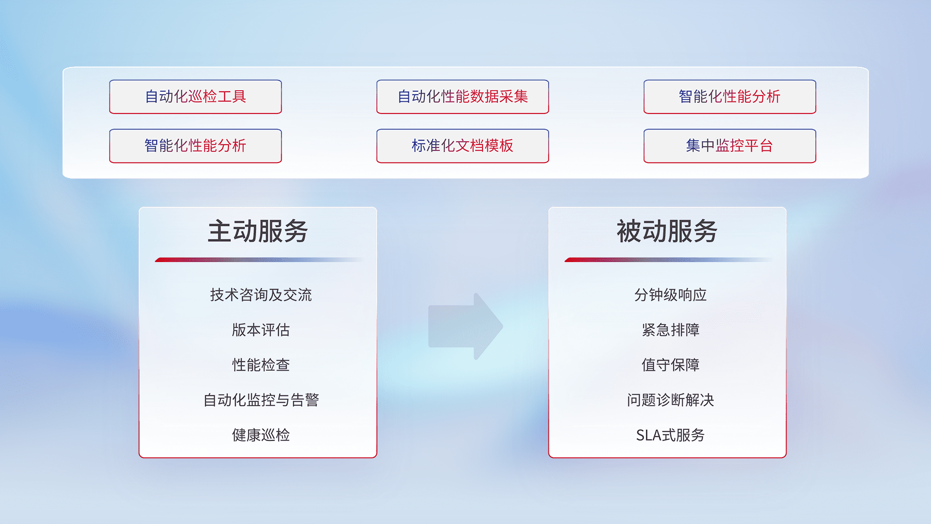 智能化工具和标准化文档,,,保障服务质量,,,,提供主动服务(包含技术咨询、、版本评估、、、、性能检查、、、、自动化监控与告警、、、、健康巡检)和被动服务包含(分钟级响应、、紧急排障、、、、值守保障、、、问题诊断解决、、SLA服务)。。。。