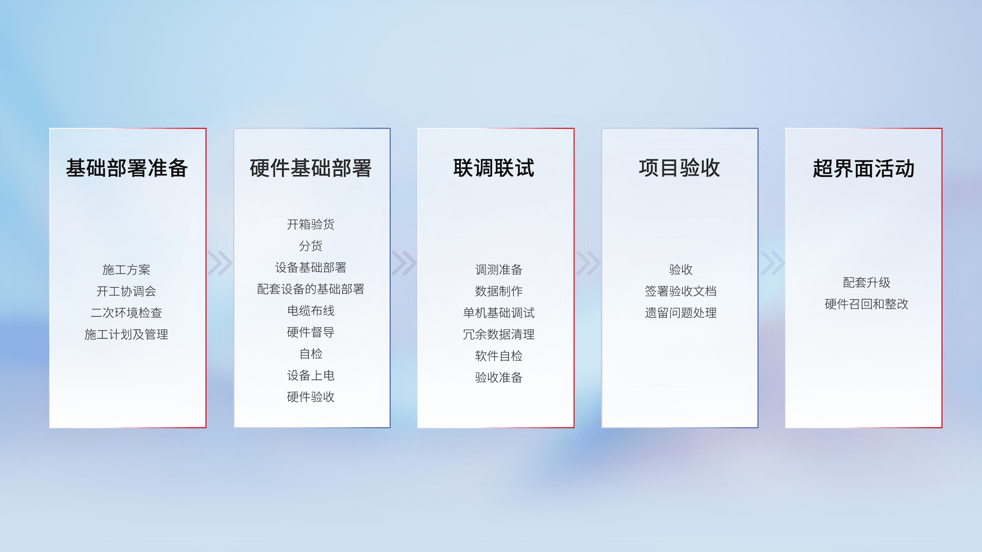从基础部署准备、、、硬件基础部署、、、联调联试、、项目验收、、、越界面活动的全过程可追溯,,,保证施工质量和进度。。